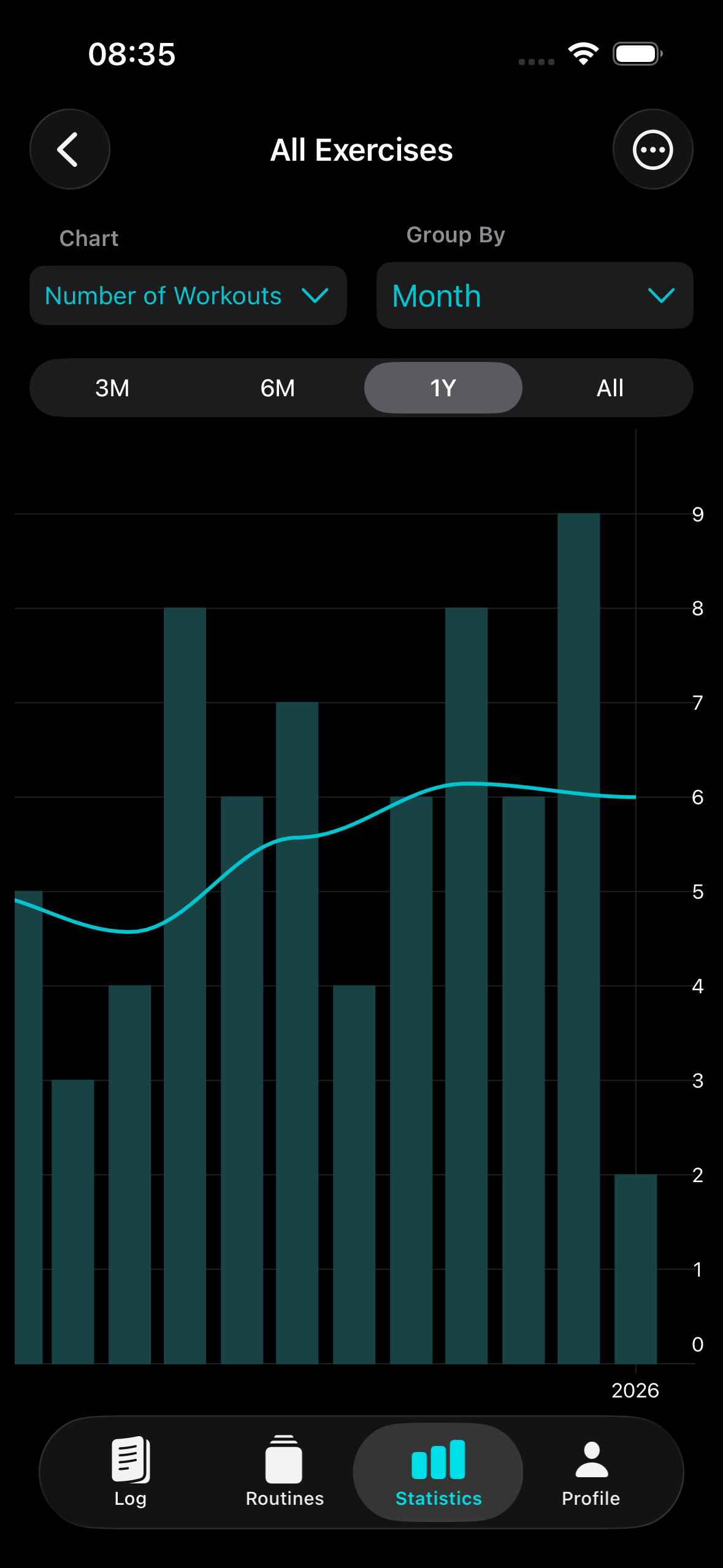 Medical-grade charting engine tracks your progression whether you've logged 5 or 5,000 workouts. See trends in volume, strength, and 1RM over time.